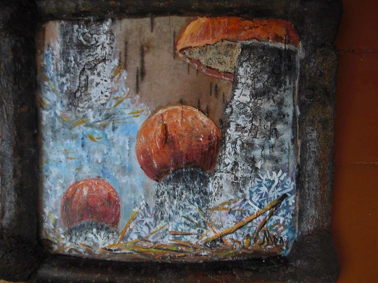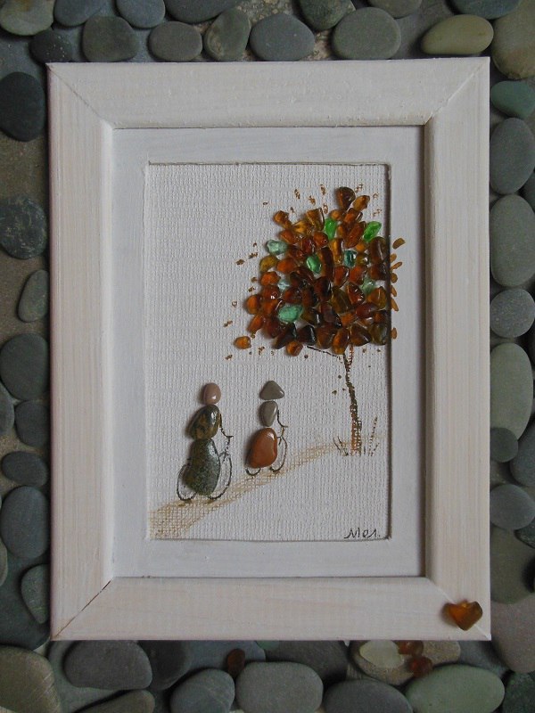 "Осенняя прогулка". Морские стеклышки, галька, картон, дерево. Размер 21-17см
