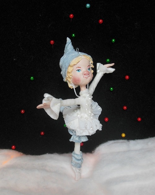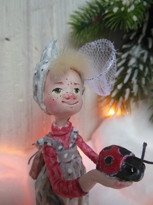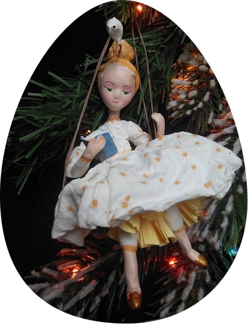 "На качелях". Елочная кукла полностью изготовлена и расписана вручную. В далеком детстве игрушки из ваты украшали нашу домашнюю елку. Они были старые. Некоторые достались нашей семье еще от бабушек, но некоторые покупали родители и там были космонавты, всякие овощи, фрукты, и фигурки детей и еще был ватный Дед Мороз. Мы очень любили их рассматривать и трогать. Они были маленькие и легкие. Сейчас ватные куклы становятся не только елочными игрушками, но и пополняют коллекции любителей кукол и используются для интерьерных композиций. Но самое главное, такие куклы несут в себе особую энергетику,они тёплые, живые. И конечно каждая кукла неповторима, со своим характером. Кукла изготовлена по старинной технологии. Чудесный подарок любимым!